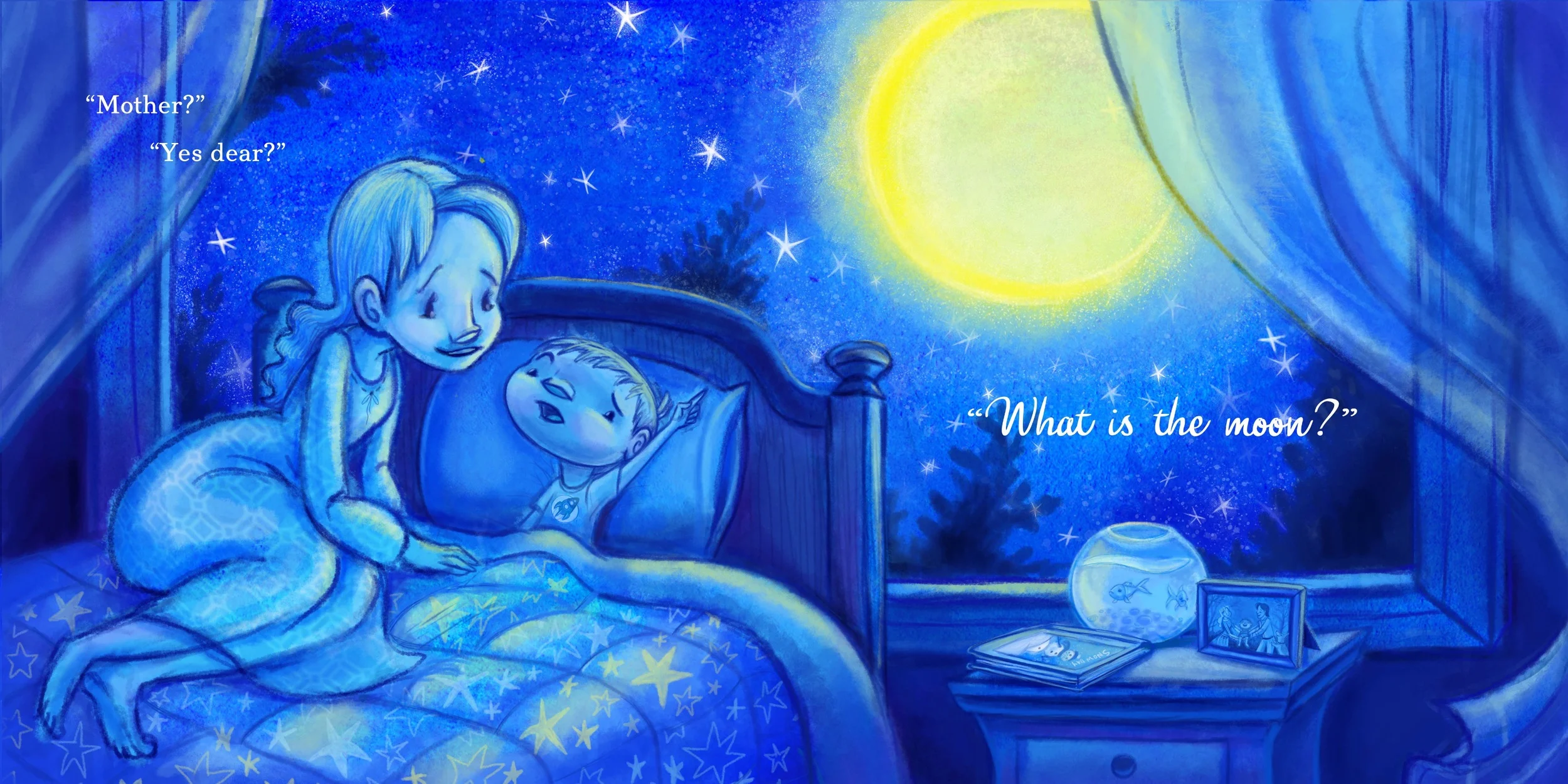 Mother, What is the Moon? is a poetic bedtime story that follows a mother and son on their journey to understand why the moon changes in the sky. On the surface, the story's metaphors are written to inspire beautiful artwork, while underneath, they carry a host of deeper meanings, hinting at the changing relationship of mother and child over time, and at our connections to the rhythms and cycles of nature.